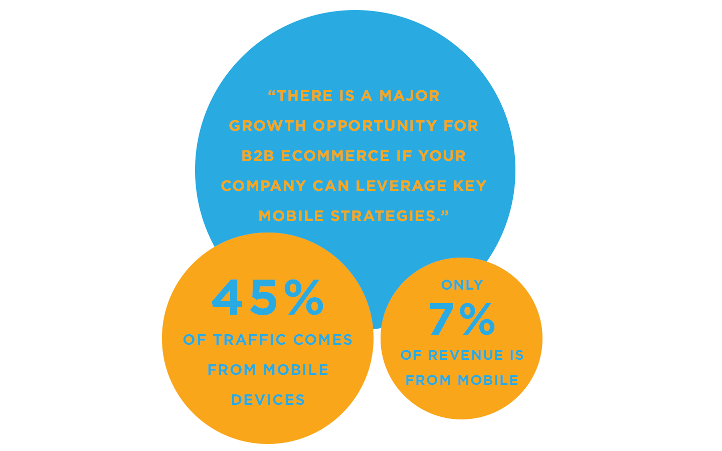 A sample business, without a proper mobile strategy, receives 45% of their traffic from mobile devices, but only 7% of their revenue from mobile transactions. There is a major growth opportunity for B2B eCommerce if your company can leverage key mobile strategies. There are a few questions you should be asking yourself this year: